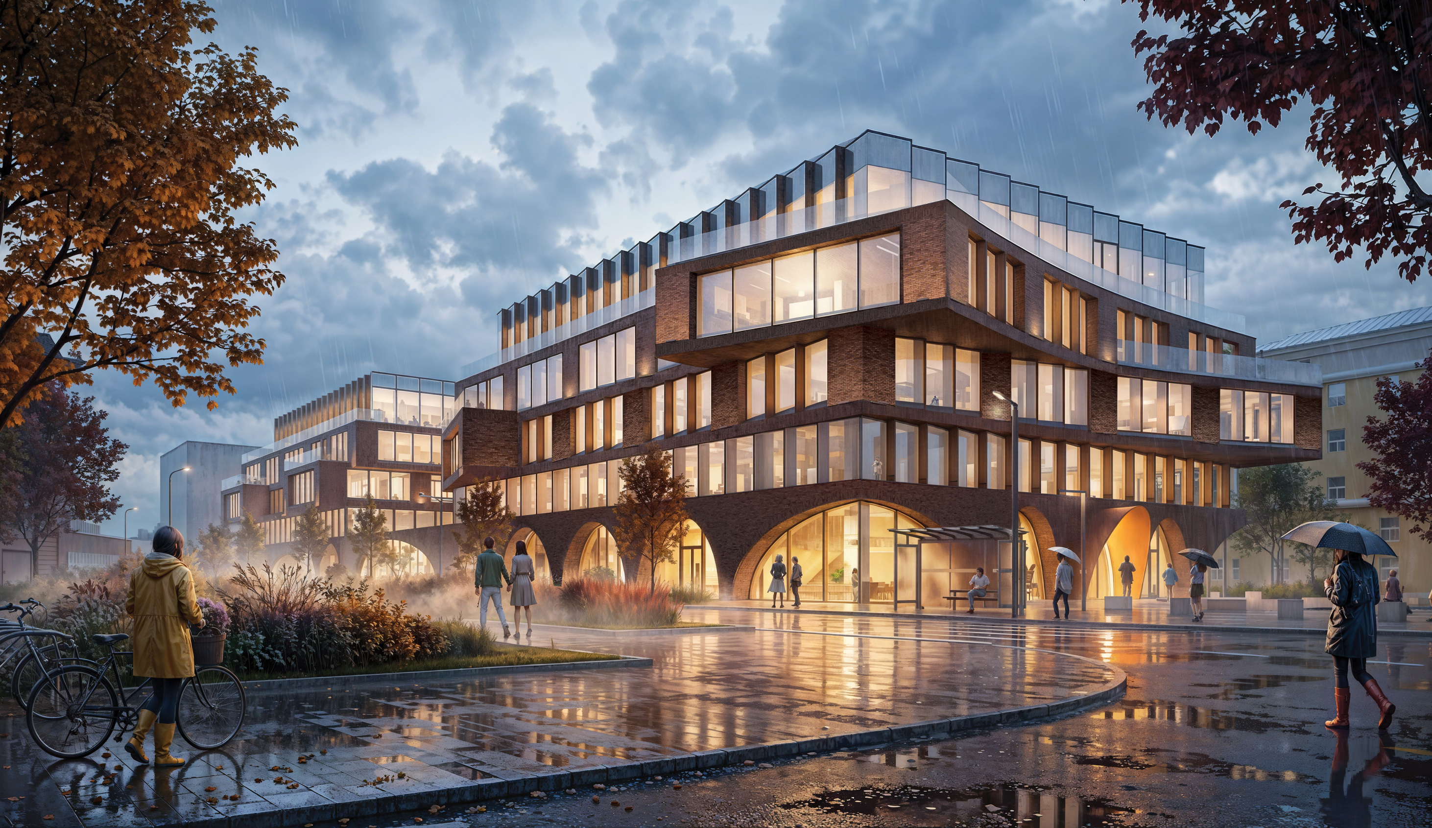 Детский сад вписан в архитектуру жилого квартала NEWПИТЕР, кирпичный фасад выполнен с панорамными эркерами и консолью над центральным входом. На кровле оборудованы зенитные фонари, которые обеспечат естественное освещение в дневное время и экономию электроэнергии. Вход на территорию детского сада запроектирован с пешеходного бульвара Белых ночей, что гарантирует детям и родителям комфорт и безопасность передвижения.
