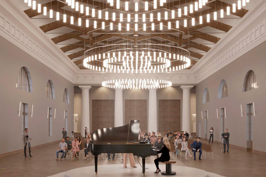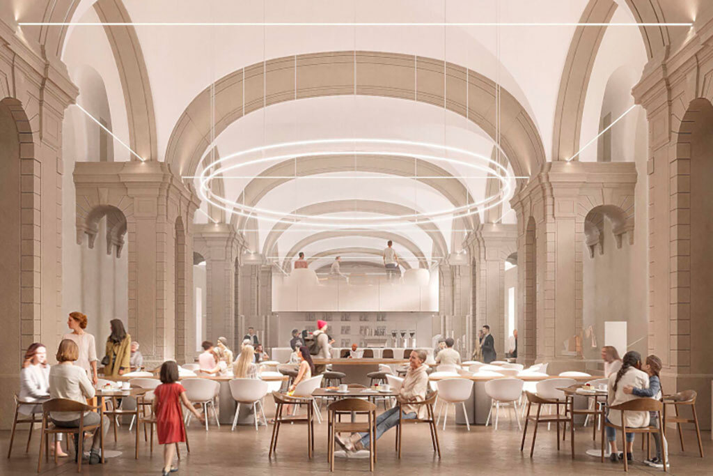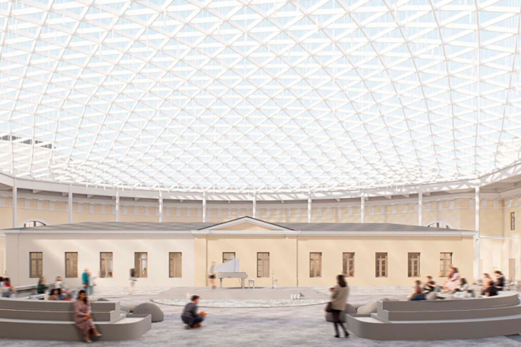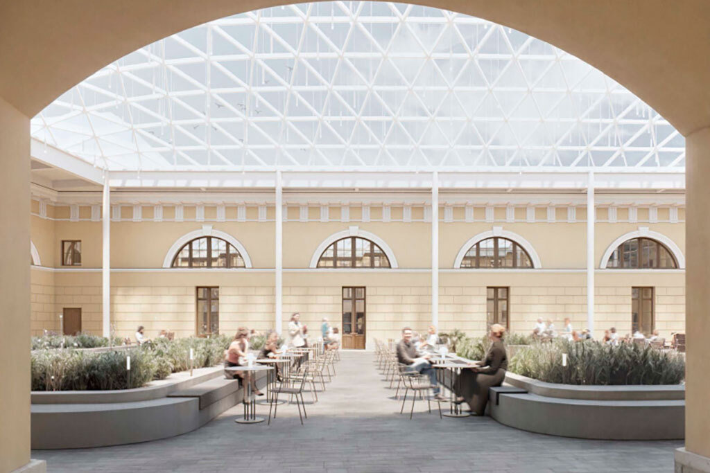 Рендеры опубликованы на сайте gov.spb.ru, автор проекта – «Студия 44»Автором проекта выступило архитектурное бюро «Студия 44». Проект предполагает воссоздание двух внутренних флигелей в их исторических объемах, превращение центрального двора в основную общественную территорию, обустройство круглогодичного гастрономического променада в западной части здания, а также организацию выставочных пространств (в том числе в бывшей квартире барона Карла Маннергейма).