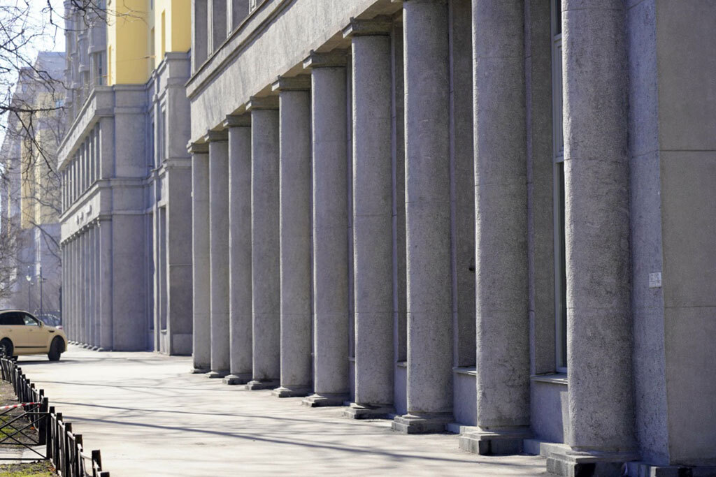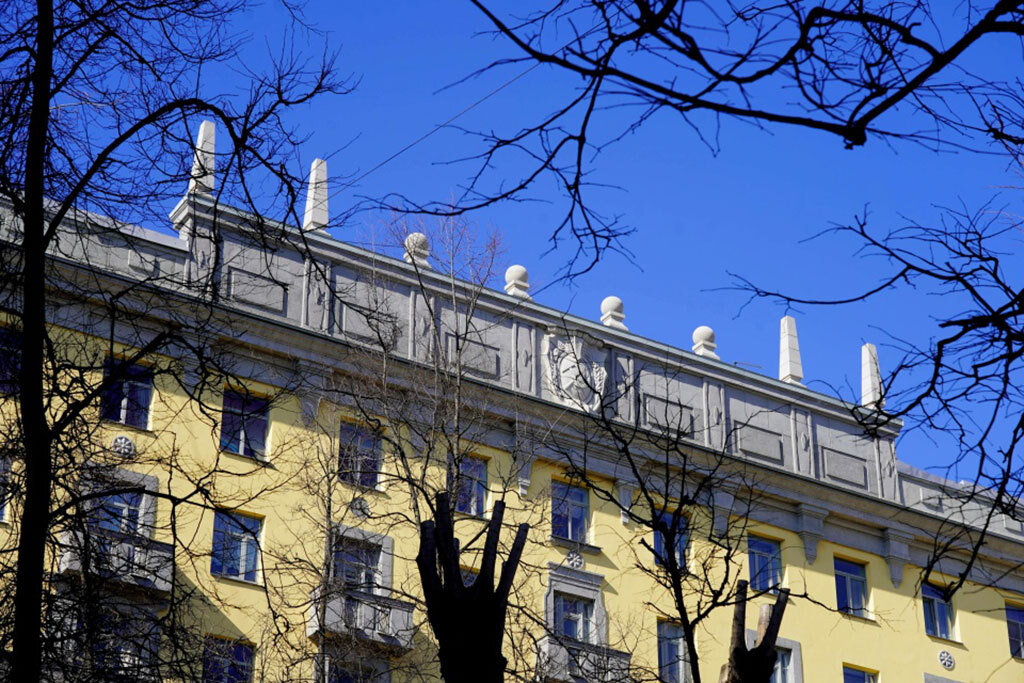 kgiop.gov.spbВ комитете отметили, что были восстановлены аварийные балконы, шары и обелиски на парапетах, отреставрированы декоративные композиции в виде герба с серпом и молотом, филенки со стилизованными снопиками колосьев, обелиски и сферы на постаментах, круглые цветочные розетки, терразитовая штукатурка. Кроме того, были выполнены штукатурные и малярные работы как со стороны лицевых, так и дворовых фасадов.